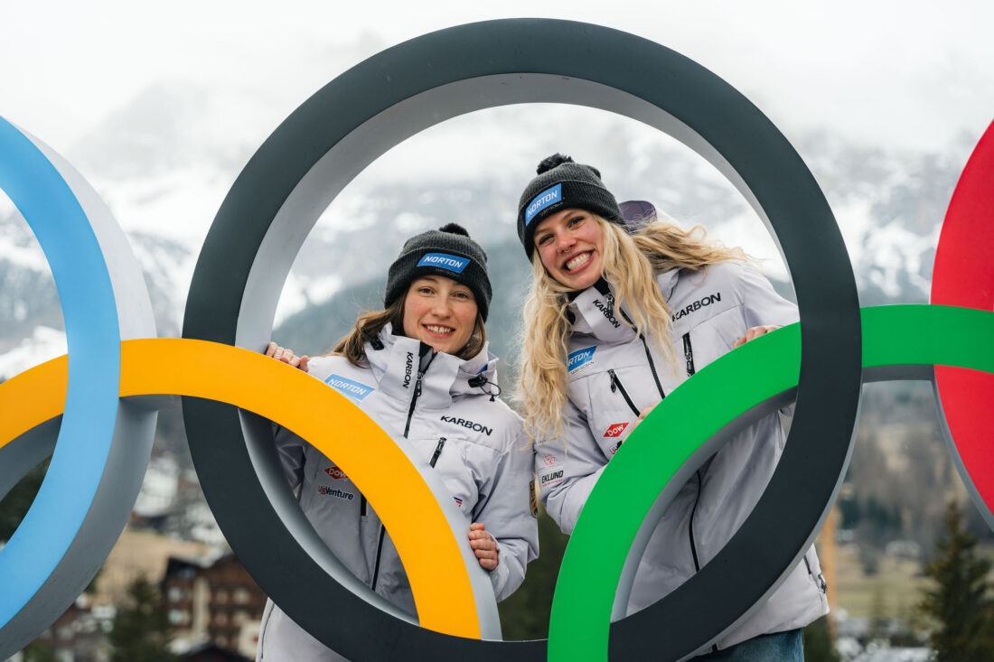The USA Luge women's doubles team of Sophia Kirkby and Chevonne Forgan pose in March 2025 in Cortina d’Ampezzo, Italy while preparing for the 2026 Olympic Winter Games. (Provided photo by FIL)
