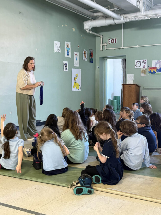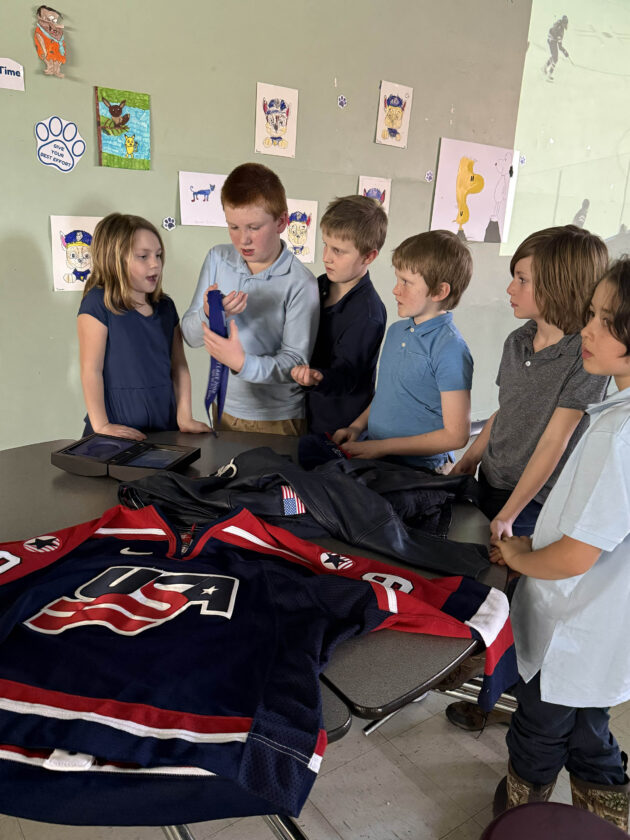 St. Bernard’s School students fawn over Principal Andrea Kilborne-Hill’s Olympic silver medal, jersey and Opening Ceremony jacket. Kilborne-Hill was on the 2002 Olympic USA women’s hockey team. The students then watched the USA versus Canada gold medal game in the school. USA won in overtime 2-1. (Provided photo — Kristin Perry)