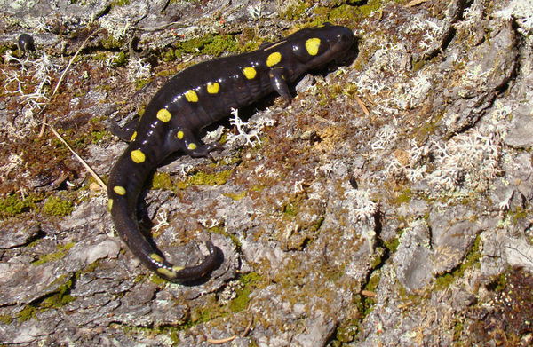 Spotted salamanders like this one are an early-season delicacy for brook trout. They will appear following the first heavy rains of the new season. Photo — Joe Hackett