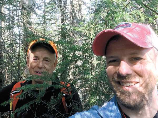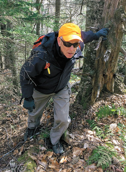 - Paul Levine bushwhacks up the north slope of Height of Land Mountain earlier this month. News photo — Justin A. Levine