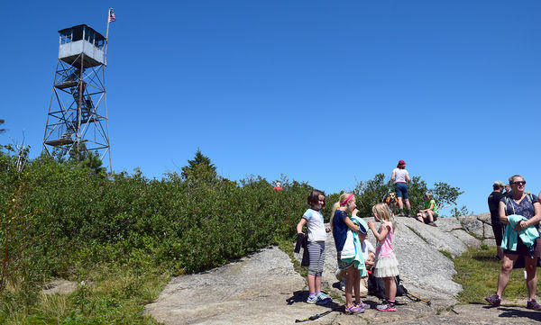 Hikers enjoy the view below the Poke-O-Moonshine fire tower in the summer of 2017. Poke-O-Moonshine Mountain is one of the featured Adirondack hikes in a new statewide hiking guide. News file photo — Justin A. Levine