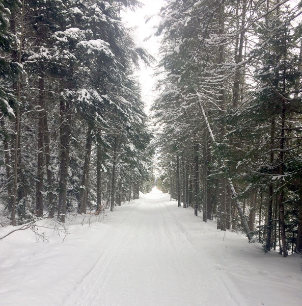 From Merrill Road, ski north through what feels like the darkest part of the trail. Lots of young-ish evergreens crowd the sides of the trail, even though it’s still about six feet wide. Round-trip from Merrill Road to Oregon Plains Road and back is 3.3 miles.