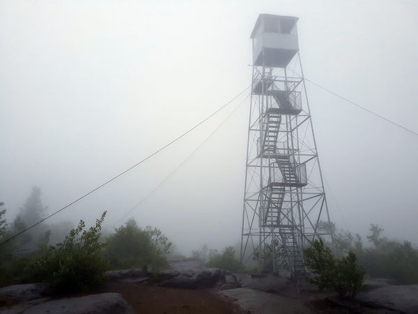 The Hadley Mountain fire tower rises into the mist. News photo — Justin A. Levine