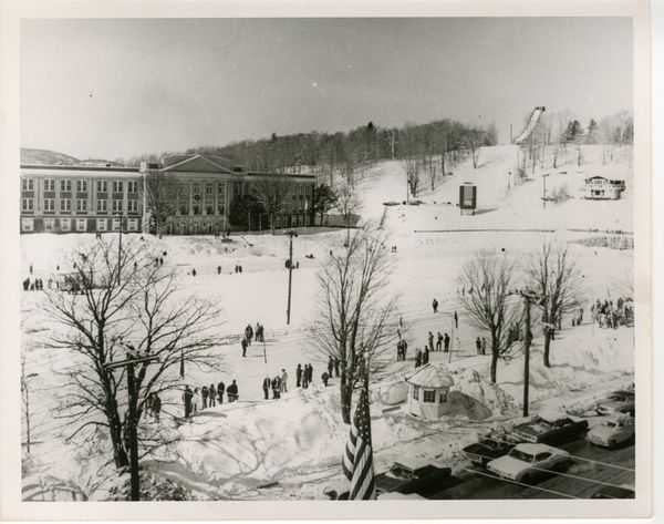 - Speedskating oval, high school and ski jump in Lake Placid (Photo — Lake Placid -North Elba Historical Society)
