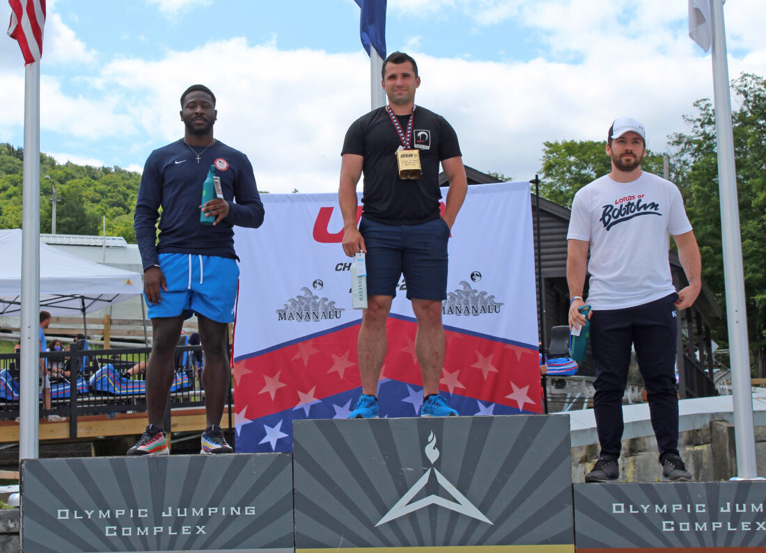 On Friday, July 30 at the new Ice House push facility at Mount Van Hoevenberg, Frank Del Duca (center) was named the 2021 USA Men’s Bobsled Push Champion, with Derek White (left) second, and Codie Bascue (right) third. (Provided photo — Naj Wikoff)
