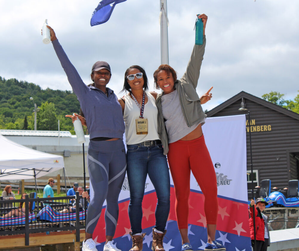 On Friday, July 30 at the new Ice House push facility at Mount Van Hoevenberg, Sylvia Hoffman (center) was named the 2021 USA Women’s Bobsled Push Champion, with Aja Evans (left) second, and Lauren Gibbs (right) and Lake Kwaza (not on stand) tied for third. (Provided photo — Naj Wikoff)