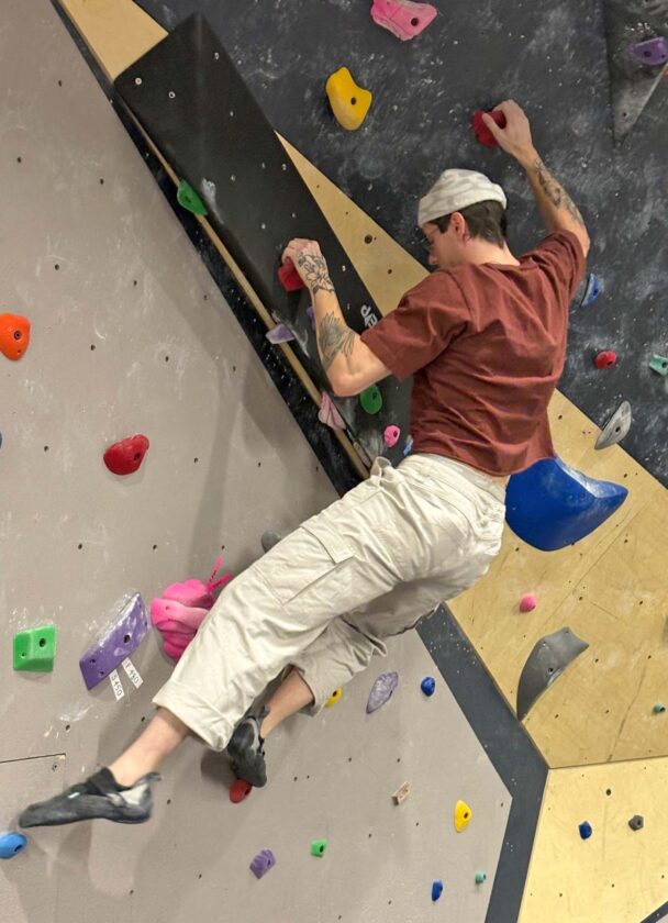 “The wall had been installed just a couple of months before,” said Kluchinski. “Jake Handerhan, climbing wall supervisor and instructor, taught me how to boulder, top rope, set, and climb. The sport has a robust community — climbing is a great social activity, and it’s mentally as well as physically challenging. Climbing a wall or bouldering is all about problem-solving: how can you get to the top, and everyone can do it differently. No route is right or wrong; it depends on your climbing style, body type and height. Climbing is a fun mental and physical challenge.”