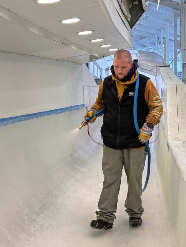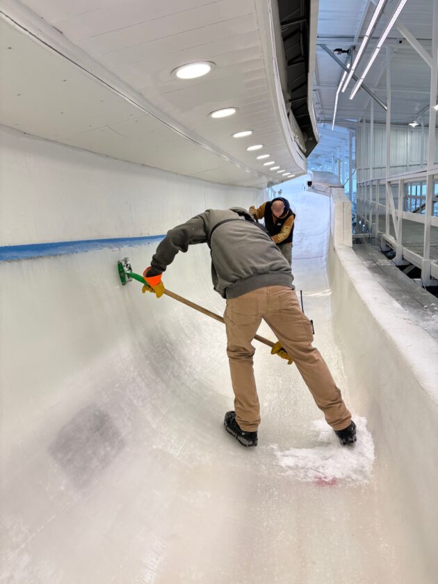 “Our job is to provide sliders with world-class ice,” said Friedrick, the crew chief. “We do a mile 4 inches at a time, usually shaving the ice 2 millimeters at a time. We build out the ice by spraying water on the track; it takes a lot of watering. We try to get ten coats on per shift. In season, we often work 10 hours or more a day. When it’s challenging, some do 15.”