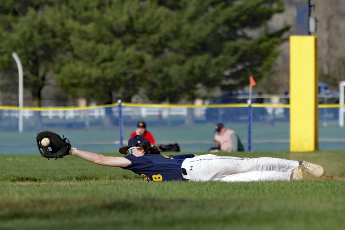 Lake Placid’s Will Landriault makes a diving stop at first base during a game against Moriah on May 6. (Provided photo — Alicia Brandes)