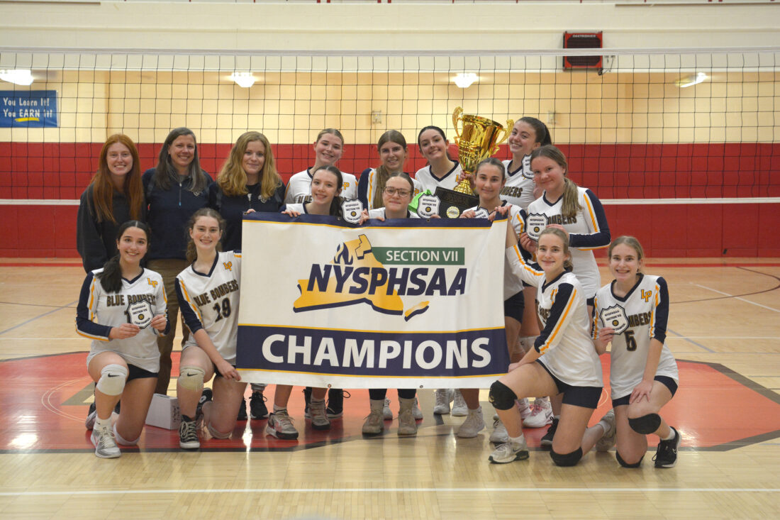 The Lake Placid volleyball team poses with the Sectional banner after defeating AuSable Valley on Nov. 6 at Saranac Central School. Pictured from left in the back are assistant coach Alexis Megliore, assistant coach Sandy Huber, head coach Mackenzie Patinella, Fiona Sullivan, Ireland Cassidy, Sophie Spanburgh and Brooke Meyer. In the middle are Ellie Shipman, Emma Lawrence, Maddie Blinn and August Hollrock. In the front are Elyse Hathaway, Avory Lamoy, Katie Adragna and Anna Adragna. (News photo — Parker O’Brien)