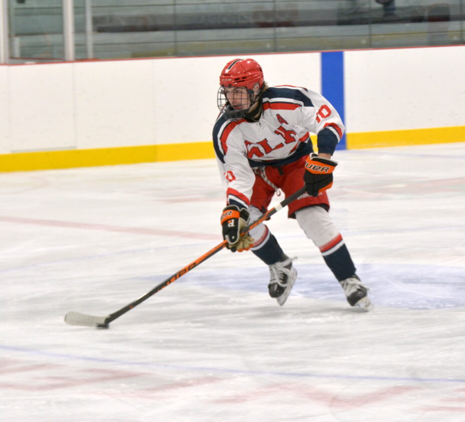 SLP’s Ayden McCormick skates with puck during the Casey McHugh Memorial tournament game against Plattsburgh Friday, Dec. 12 at the Saranac Lake Civic Center. (News photo — Parker O’Brien)