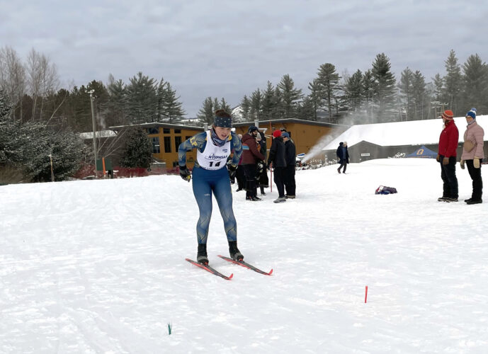- Lake Placid’s Holly Erenstone crosses the finish line to give her team the victory on Dec. 27 in North Creek. (Provided photo)