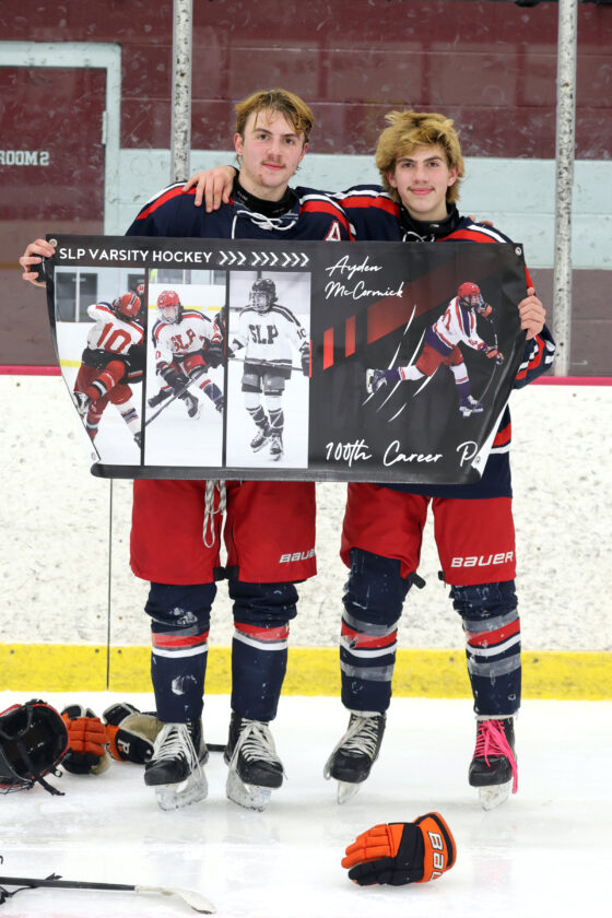 The shot gave McCormick his 100th career point, and he became the first-ever SLP player to reach the feat since the two schools merged boys hockey teams in 2019. The milestone hat trick goal also just so happened to come on a feed from his younger brother, Eli McCormick.