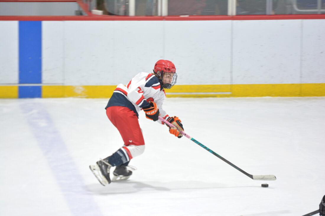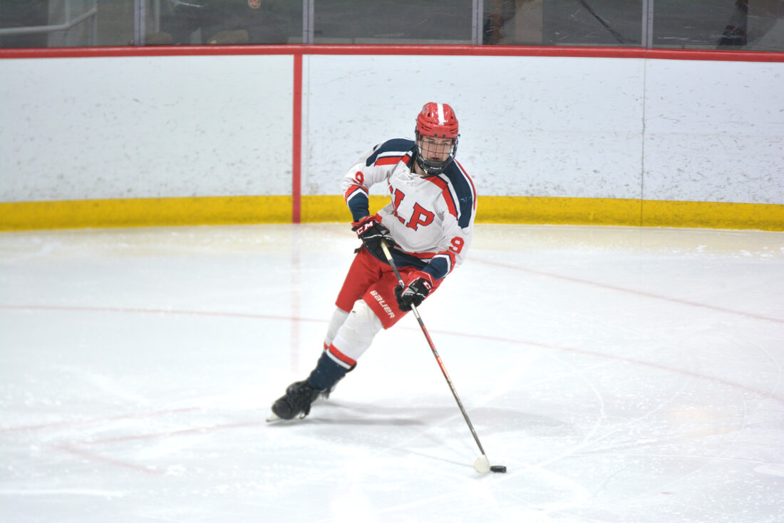 SLP’s Eli McCormick skates with the puck during the Lake Placid Winter Carnival championship game on Jan. 24 against Plattsburgh at the Olympic Center in Lake Placid. (News photo — Parker O’Brien)
