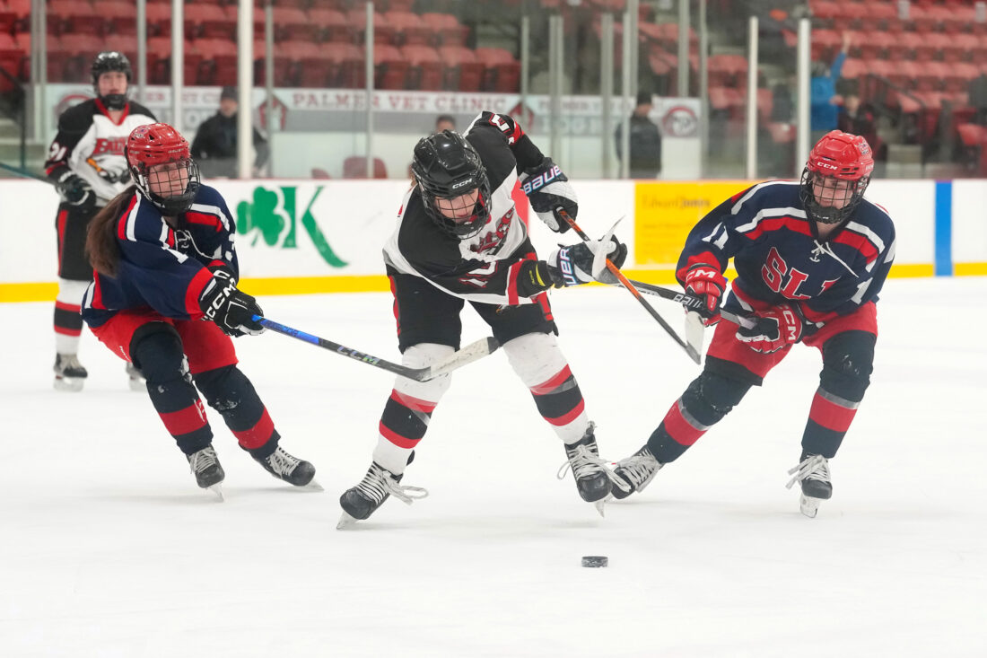 From left, SLP’s Harper Strack fights for the puck with Beekmantown’s Meegan Burdo and SLP’s Madison Blinn during the Section VII girls hockey championship game at the Plattsburgh State Fieldhouse on Feb. 9. (Provided photo — Joey LaFranca)