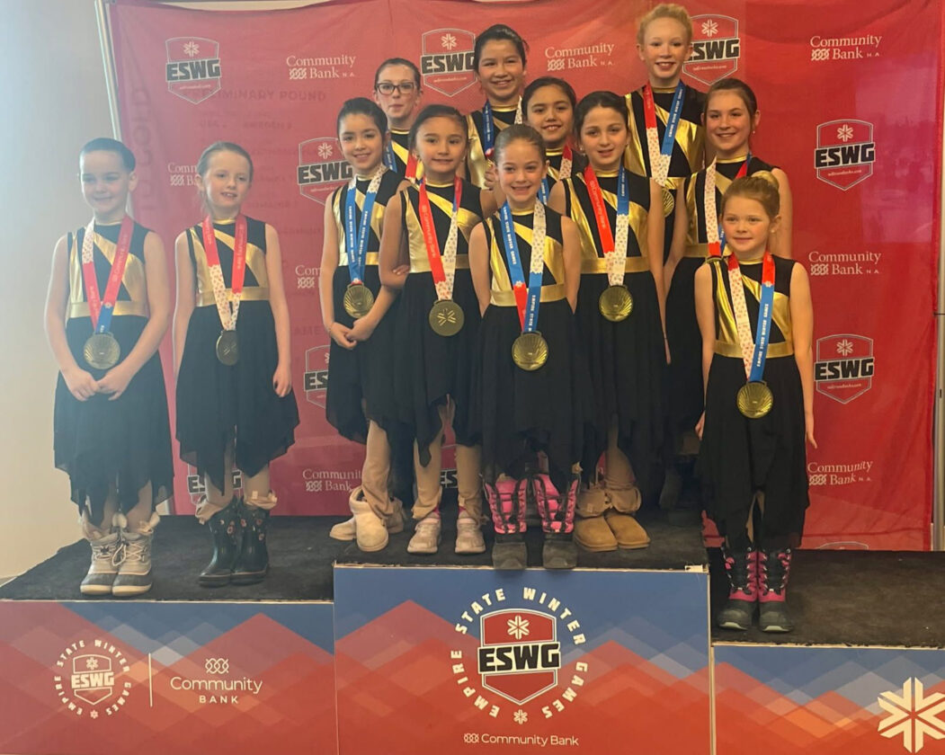 The Skating Club of Lake Placid’s Crystal Edges synchronized skating team smiles with their gold medals at the Empire State Winter Games on Feb. 9 in Lake Placid. Pictured are Grace Riley, Georgia Ruttan, Eloise Ruttan, Lesa LaRose, Gabby Hudak, Taika Mzese, Dakota Kilgore, Sara Leon, Kiara Mesa Sanchez, Kayla Curry, Ainsley Beaulieu and Emilienne Bealieu. (Photo provided)