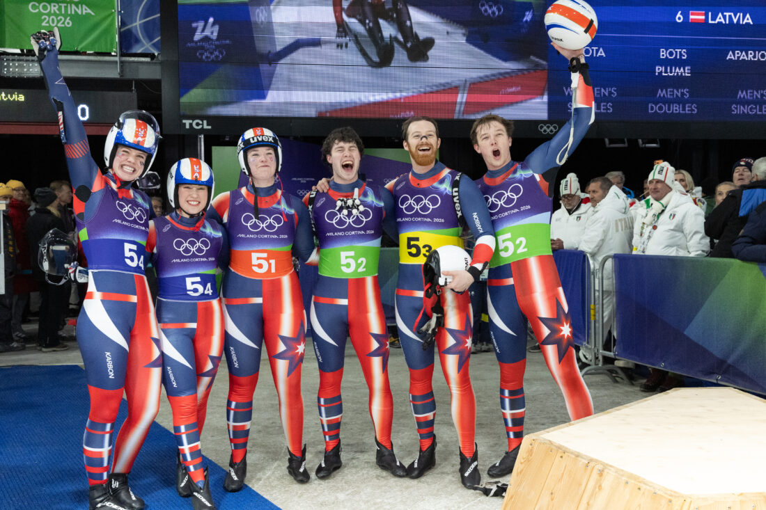 From left, USA Luge’s Chevonne Forgan, Sophia Kirkby, Ashley Farquharson, Ansel Haugsjaa, Jonny Gustafson and Marcus Mueller smile after competing in the Olympic Team Relay event on Thursday, Feb. 12 at the Cortina d’Ampezzo Sliding Center in Italy. (Provided photo — FIL/Michael Kristen)